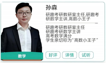 作为研趣考研教研室主任,孙森老师在考研数学辅导领域深耕十余载,主讲高等数学、线性代数、概率论与数理统计三门核心科目。他的课堂总能用深入浅出的语言化解数学难点,风趣幽默的风格更是打破了数学学习的枯燥感,被学员亲切称为 “高数小王子”。不少学员反馈:“孙森老师讲题特别通透,不仅能快速讲明白一道题,还能教会一整个题型的解题思路,答疑也特别及时负责!”“跟着孙老师学数学,之前的畏难情绪都没了,现在做题越来越有底气!”